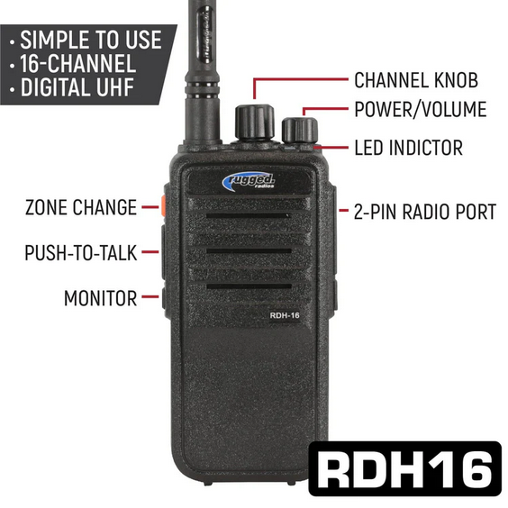 - Powerful Radios: RDH16 UHF digital handheld radios