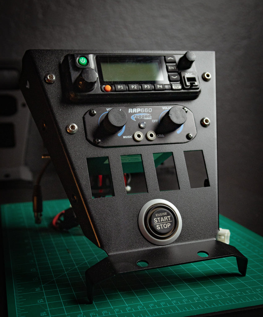 Need more switches with your Rugged Radio's setup? This ones for you! Flush Mount for Rugged Radios Setup and 4 extra spots for your switches! Panels and console are laser cut and powder coated with a texture coat for durability and flush fit. Guaranteed your radios and intercom will not stick out they will sit nice a flush for a good looking finish. Hardware for mounting your radios and intercom are included.