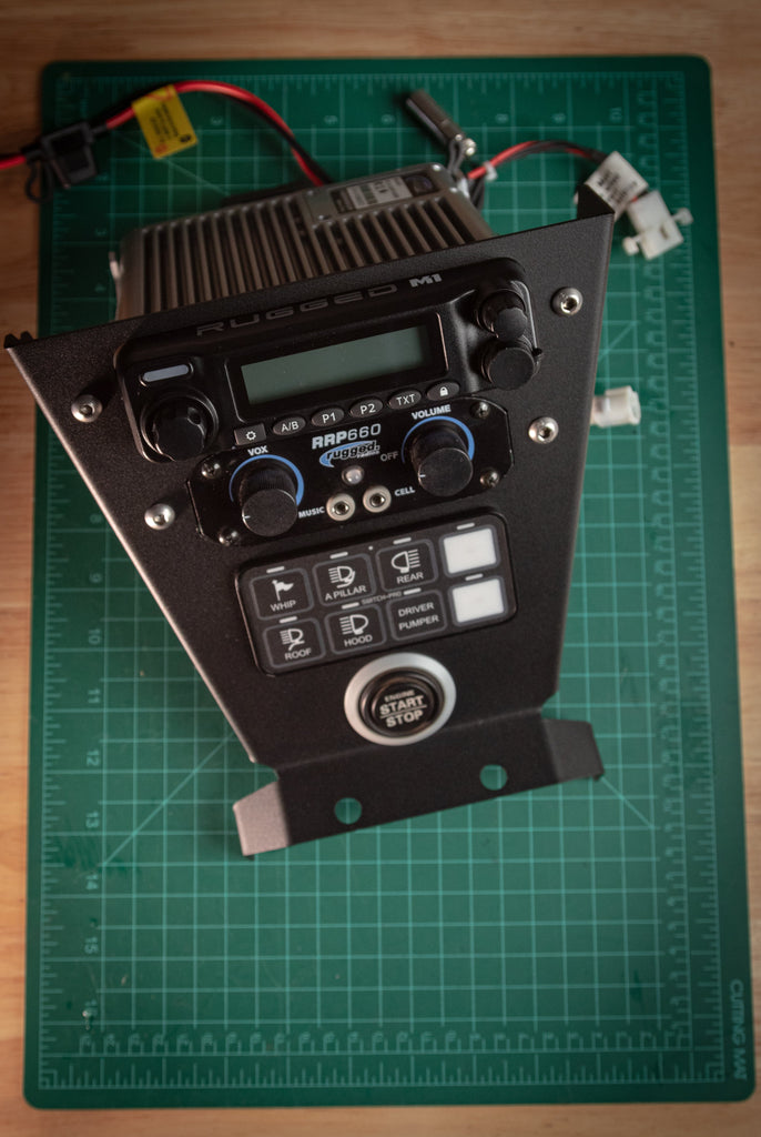 Got a Switchpro with your M1 Radio/Intercom? This ones for you! Flush Mount for Rugged Radios Setup and fit your Switchpro switch board, Panels and console are laser cut and powder coated with a texture coat for durability and flush fit. Guaranteed your radios and intercom will not stick out they will sit nice a flush for a good looking finish. Switch pro sits perfectly and mounts with hardware provided by Switchpro. Hardware for mounting your radios and intercom are included.