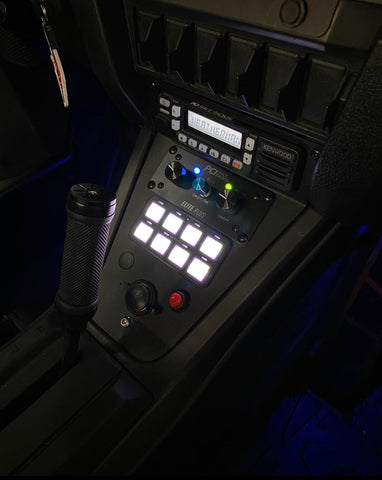This console was designed to keep your top row of factory switches on your Pro/R. This will allow you to mount your radios in the factory area of your rocker switches, as well as mount your switchpro! factory 12v socket and 2 PTT slots. Console extend all the way down the lower section fitting it nice and flush for a factory look. This console will house your radio, intercom, switchpro 9100 and your 12v. The radio cradle keep the console nice and clean with a factory look.